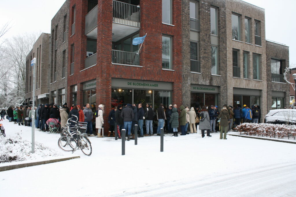 Traditioneel nog steeds in de Nieuwstraat en voor de Leuttappers aankomen een mooi rij mensen welke al was ontstond toen de sneeuw haar eerste echte vormen aannam.